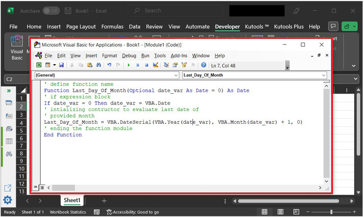 ' define function name Function Last_Day_Of_Month(Optional date_var As Date = 0) As Date ' if expression block If date_var = 0 Then date_var = VBA.Date ' intializing contructor to evaluate last date of ' provided month Last_Day_Of_Month = VBA.DateSerial(VBA.Year(date_var), VBA.Month(date_var) + 1, 0) ' ending the function module End Function