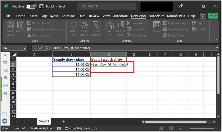 之後返回到Excel工作表並單擊所需的位置。對於這種情況,考慮的單元格是“C2”。之後在單元格中鍵入“=Last_Day_Of_Month(B2)”。最後,按“Enter”鍵。