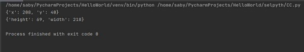 from selenium import webdriver driver = webdriver.Chrome(executable_path="C:\chromedriver.exe") driver.implicitly_wait(0.5) driver.get("https://tutorialspoint.tw/about/about_careers.htm") #identify element l= driver.find_element_by_xpath("//img[@class='tp-logo']") #get x, y coordinates loc = l.location #get height, width s = l.size print(loc) print(s) driver.close()