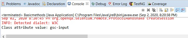 import org.openqa.selenium.By; import org.openqa.selenium.WebDriver; import org.openqa.selenium.WebElement; import org.openqa.selenium.chrome.ChromeDriver; import java.util.concurrent.TimeUnit; public class GetClssAttribute{ public static void main(String[] args) { System.setProperty("webdriver.chrome.driver","C:\Users\ghs6kor\Desktop\Java\chromedriver.exe"); WebDriver driver = new ChromeDriver(); String url = "https://tutorialspoint.tw/index.htm"; driver.get(url); driver.manage().timeouts().implicitlyWait(4, TimeUnit.SECONDS); // identify element WebElement l = driver.findElement(By.id("gsc-i-id1")); // get class attribute with getAttribute() String val = l.getAttribute("class"); System.out.println("Class attribute value: " + val); driver.quit() } }