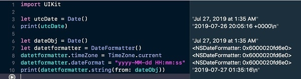 let dateObj = Date() let datetformatter = DateFormatter() datetformatter.timeZone = TimeZone.current datetformatter.dateFormat = "yyyy-MM-dd HH:mm:ss" print(datetformatter.string(from: dateObj))