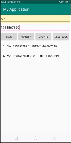 在上面的程式碼中,我們使用了名稱和薪資作為 EditText,當用戶點選儲存按鈕時,它會將資料儲存到 SQLite 資料庫中。點選重新整理按鈕以獲取 ListView。