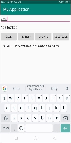 在上面的程式碼中,我們使用了姓名和薪資作為編輯文字,當用戶點選儲存按鈕時,它會將資料儲存到 SQLite 資料庫中。點選重新整理按鈕以獲取列表檢視。