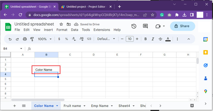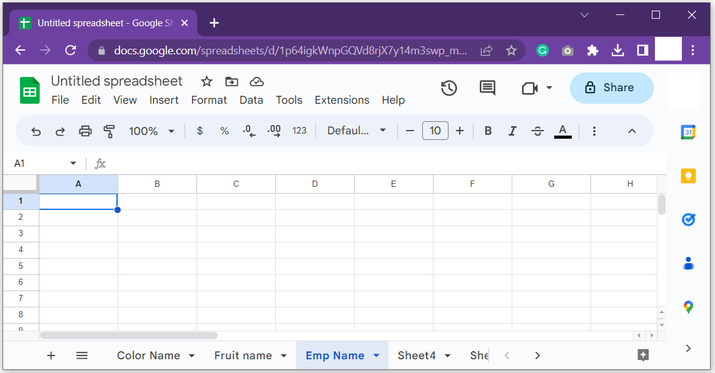 對於此示例,首先開啟Google工作表。現在,建立5個名稱不同的工作表。對於此示例,工作表名稱列在下面給出的快照中。此示例的主要目的是在呼叫所寫方法的單元格內顯示當前Google工作表的名稱。