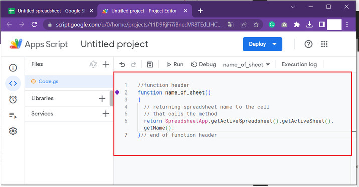 示例1:在生成函式呼叫的活動單元格中顯示當前Google工作表名稱的示例