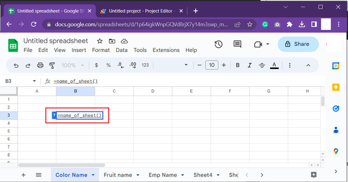 之後返回Google工作表,並選擇任何單元格。對於此示例,將選擇B3單元格,並在單元格內鍵入“=name_of_sheet()”,然後按“Enter”鍵。單元格將顯示當前Google工作表的名稱。