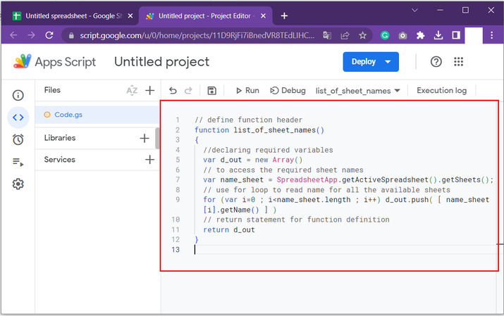 Google Sheets是由Google開發的基於雲的電子表格程式。它允許使用者線上建立、編輯和協作處理電子表格,並與其他使用者即時協作。Google Sheets類似於Microsoft Excel,但它增加了更多功能,使其更具協作性和易用性。使用者可以建立和格式化單元格,從其他來源匯入資料,並使用函式和公式執行計算和分析資料。工作表也可以與其他人共享以進行即時協作和編輯,這使其成為團隊和組織的有用工具。它可以透過任何網路瀏覽器訪問,並且可以作為Android和iOS裝置的移動應用程式使用。本文將指導使用者獲取工作表名稱的過程。本文將方法分解為兩個示例。第一個示例指導使用者如何使用指令碼程式碼獲取當前工作表名稱,第二個示例簡要介紹了在當前工作表上生成所有可用Google工作表列表的程式碼。
