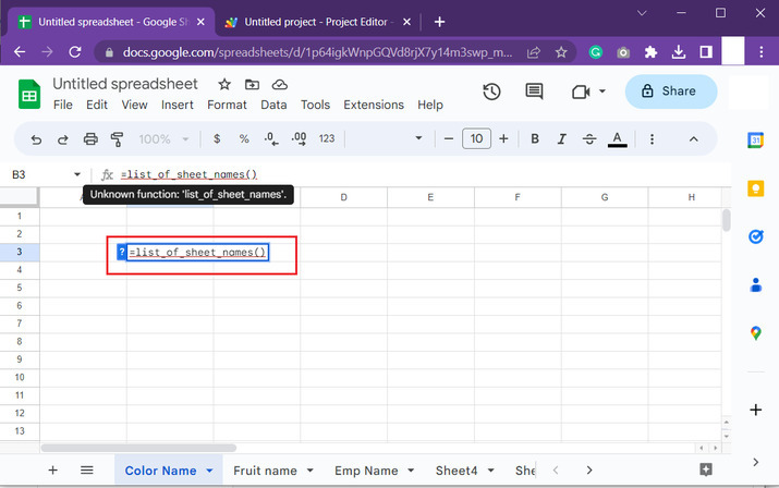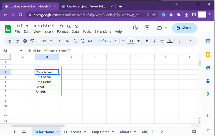 之後返回Google工作表,並選擇任何單元格。對於此示例,將選擇B3單元格,並在單元格內鍵入“=list_of_sheet_name()”,然後按“Enter”鍵。單元格將顯示當前Google工作表中可用工作表的名稱。