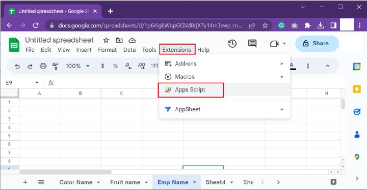 在此示例中,主要重點是將可用Google工作表列表顯示到當前工作表。為此,再次考慮相同的表。轉到“擴充套件”選項卡,然後單擊“App Script”選項。請參考下面提供的快照以清楚地瞭解步驟。