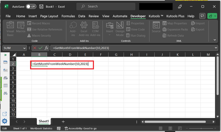 再次轉到Excel工作表,並鍵入“=GetMonthFromWeekNumber(10,2023)”。指定的命令將接受週數和年份作為引數。