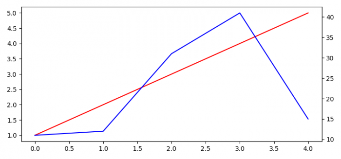 import matplotlib.pyplot as plt plt.rcParams["figure.figsize"] = [7.50, 3.50] plt.rcParams["figure.autolayout"] = True fig, ax1 = plt.subplots() ax1.plot([1, 2, 3, 4, 5], color='red') ax2 = ax1.twinx() ax2.plot([11, 12, 31, 41, 15], color='blue') plt.show()