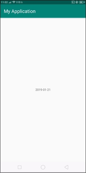 <?xml version="1.0" encoding="utf-8"?> <android.support.constraint.ConstraintLayout xmlns:android="http://schemas.android.com/apk/res/android" xmlns:app="http://schemas.android.com/apk/res-auto" xmlns:tools="http://schemas.android.com/tools" android:layout_width="match_parent" android:layout_height="match_parent" tools:context=".MainActivity"> <TextView android:id="@+id/date" android:layout_width="wrap_content" android:layout_height="wrap_content" android:text="Local Date" app:layout_constraintBottom_toBottomOf="parent" app:layout_constraintLeft_toLeftOf="parent" app:layout_constraintRight_toRightOf="parent" app:layout_constraintTop_toTopOf="parent" /> </android.support.constraint.ConstraintLayout>