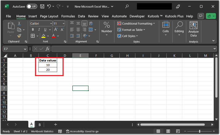對於此示例,我們將考慮兩個工作表,即工作表A和工作表B。在工作表A上,在C列建立一個包含兩行的表格。此列包含一些資料值。