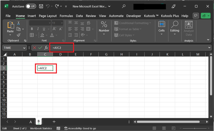 對於此示例,在B Excel工作表中鍵入公式“=A!C2”。有關更多說明,請參閱以下快照: