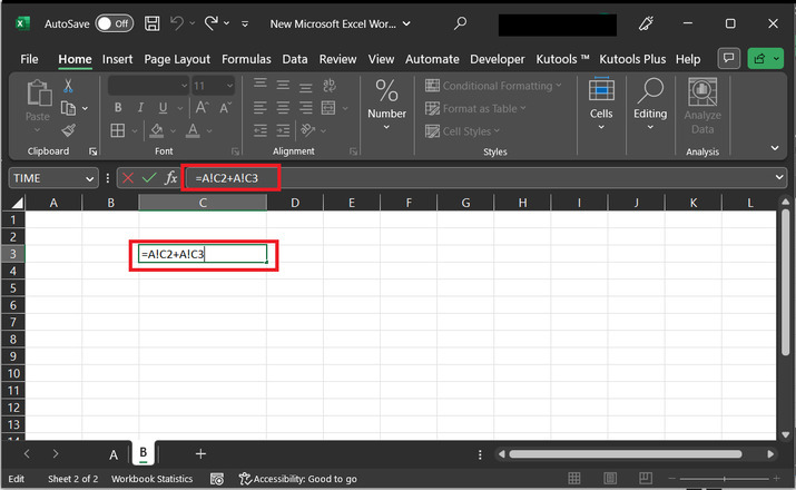 1) 在公式欄中使用公式“=SUM(A!C2, A!C3)”。