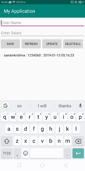 在上面的程式碼中,我們使用了名稱和薪水作為編輯文字,當用戶點選儲存按鈕時,它會將資料儲存到SQLite資料庫中。插入值後,點選重新整理按鈕以使用**特定日期資料**更新列表檢視。如果使用者點選更新按鈕,它將更新資料。