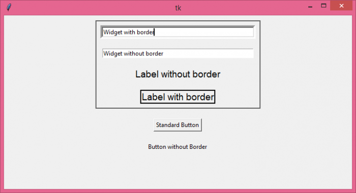 # Import the required libraries from tkinter import * #Create an instance of tkinter frame root=Tk() # Set the geometry of frame root.geometry("700x350") # Create a canvas widget canvas= Canvas(root, bd=2, highlightthickness=2) canvas.pack(side=TOP, padx=10, pady=10) # Create an Entry widget text=Entry(canvas, width=50) text.insert(0, "Widget with border") text.config(borderwidth=5) text.pack(side=TOP, padx=10, pady=10) # Create Entry widget without border text=Entry(canvas, width=50) text.insert(0, "Widget without border") text.pack(side=TOP, padx=10, pady=10) label1 = Label(canvas, text="Label with border", borderwidth=2, relief='solid', font="Calibri, 14") label1.pack(side=BOTTOM, padx=10, pady=10) label2 = Label(canvas, text="Label without border", borderwidth=0, font="Calibri, 14") label2.pack(side=BOTTOM, padx=10, pady=10) button1 = Button(root, text="Standard Button") button1.pack(side=TOP, padx=10, pady=10) button2 = Button(root, text="Button without Border", borderwidth=0) button2.pack(side=TOP, padx=10, pady=10) root.mainloop()