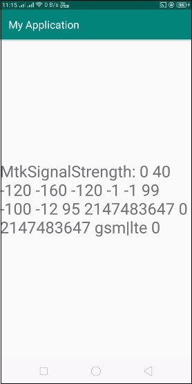 package com.example.myapplication; import android.Manifest; import android.content.Context; import android.content.pm.PackageManager; import android.os.Build; import android.os.Bundle; import android.support.annotation.NonNull; import android.support.annotation.RequiresApi; import android.support.v4.app.ActivityCompat; import android.support.v7.app.AppCompatActivity; import android.telephony.TelephonyManager; import android.widget.TextView; import static android.Manifest.permission.ACCESS_COARSE_LOCATION; import static android.Manifest.permission.READ_PHONE_NUMBERS; import static android.Manifest.permission.READ_PHONE_STATE; import static android.Manifest.permission.READ_SMS; public class MainActivity extends AppCompatActivity { private static final int PERMISSION_REQUEST_CODE = 100; TextView textView; TelephonyManager telephonyManager; @RequiresApi(api = Build.VERSION_CODES.P) @Override protected void onCreate(Bundle savedInstanceState) { super.onCreate(savedInstanceState); setContentView(R.layout.activity_main); textView = findViewById(R.id.text); telephonyManager = (TelephonyManager) this.getSystemService(Context.TELEPHONY_SERVICE); if (ActivityCompat.checkSelfPermission(this, READ_SMS) != PackageManager.PERMISSION_GRANTED && ActivityCompat.checkSelfPermission(this, READ_PHONE_NUMBERS) != PackageManager.PERMISSION_GRANTED && ActivityCompat.checkSelfPermission(this, ACCESS_COARSE_LOCATION) != PackageManager.PERMISSION_GRANTED && ActivityCompat.checkSelfPermission(this, READ_PHONE_STATE) != PackageManager.PERMISSION_GRANTED) { ActivityCompat.requestPermissions(this, new String[]{READ_SMS, READ_PHONE_NUMBERS, READ_PHONE_STATE,ACCESS_COARSE_LOCATION}, PERMISSION_REQUEST_CODE); } else { textView.setText(""+telephonyManager.getSignalStrength()); } } @RequiresApi(api = Build.VERSION_CODES.P) @Override public void onRequestPermissionsResult(int requestCode, @NonNull String[] permissions, @NonNull int[] grantResults) { super.onRequestPermissionsResult(requestCode, permissions, grantResults); switch (requestCode) { case PERMISSION_REQUEST_CODE: if (ActivityCompat.checkSelfPermission(this, READ_SMS) != PackageManager.PERMISSION_GRANTED && ActivityCompat.checkSelfPermission(this, READ_PHONE_NUMBERS) != PackageManager.PERMISSION_GRANTED && ActivityCompat.checkSelfPermission(this, ACCESS_COARSE_LOCATION) != PackageManager.PERMISSION_GRANTED && ActivityCompat.checkSelfPermission(this, READ_PHONE_STATE) != PackageManager.PERMISSION_GRANTED) { return; } else { textView.setText(""+telephonyManager.getSignalStrength()); } } } }
