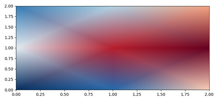 import matplotlib.pylab as plt import numpy as np plt.rcParams["figure.figsize"] = [7.50, 3.50] plt.rcParams["figure.autolayout"] = True data = np.random.random((3, 3)) x = np.arange(0, 3, 1) y = np.arange(0, 3, 1) x, y = np.meshgrid(x, y) plt.pcolormesh(x, y, data, cmap='RdBu', shading='gouraud') plt.show()