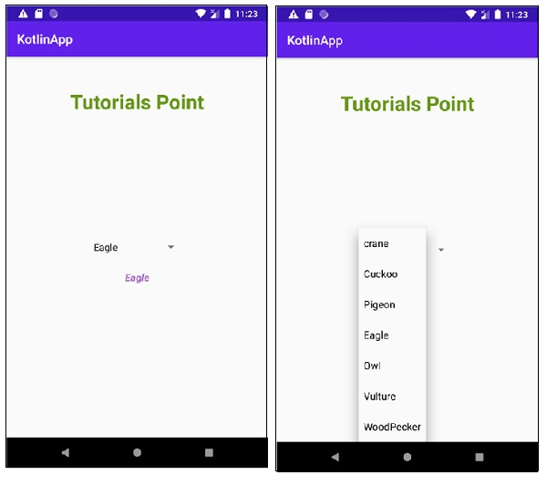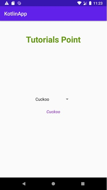 <?xml version="1.0" encoding="utf-8"?> <RelativeLayout xmlns:android="http://schemas.android.com/apk/res/android" xmlns:tools="http://schemas.android.com/tools" android:layout_width="match_parent" android:layout_height="match_parent" tools:context=".MainActivity"> <TextView android:layout_width="wrap_content" android:layout_height="wrap_content" android:layout_centerHorizontal="true" android:layout_marginTop="50dp" android:text="Tutorials Point" android:textAlignment="center" android:textColor="@android:color/holo_green_dark" android:textSize="32sp" android:textStyle="bold" /> <Spinner android:id="@+id/spinner" android:layout_width="wrap_content" android:layout_height="wrap_content" android:layout_centerInParent="true" /> <TextView android:id="@+id/textView" android:layout_width="wrap_content" android:layout_height="wrap_content" android:layout_below="@id/spinner" android:layout_centerInParent="true" android:layout_marginTop="25dp" android:textColor="@android:color/holo_purple" android:textSize="16sp" android:textStyle="italic|bold" /> </RelativeLayout>
