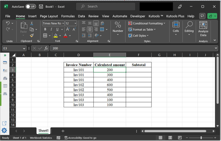 計算發票的小計是發票的重要組成部分。它允許使用者在輸入發票總金額後瞭解總金額。在本文中,學習者將逐步瞭解如何生成所提供發票號碼的小計。例如,如果發票 101 有三個條目 100、200 和 300,則計算出的子總金額將變為 600。在本文中,使用者使用公式和方法實現了子總計值。
