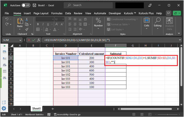 SUMIF($D:$D,D3,$E:$E) - 這部分計算當前發票號碼的金額總和。它在 D 列中搜索當前發票號碼的所有出現,並在 E 列中對相應的金額求和。如果計數等於 1,則計算小計並在當前行中顯示。如果計數不等於 1,則單元格保持空白。