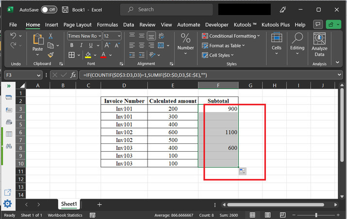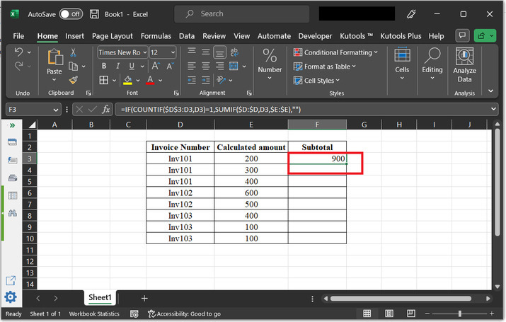 IF 函式檢查計數是否等於 1。如果是,則這是發票號碼的第一次出現,並計算小計。如果不等於 1,則無需計算小計,單元格將為空白。