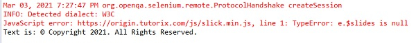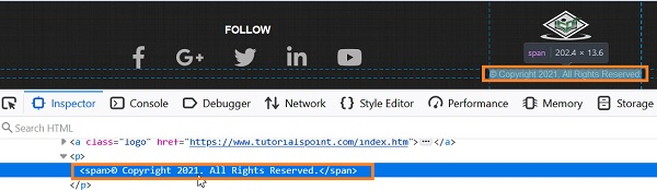 可以透過 getText 方法捕獲一個 Web 元素的文字。讓我們看一個包含文字的元素的示例 - © Copyright 2021. All Rights Reserved 封閉在 span 標籤中。
