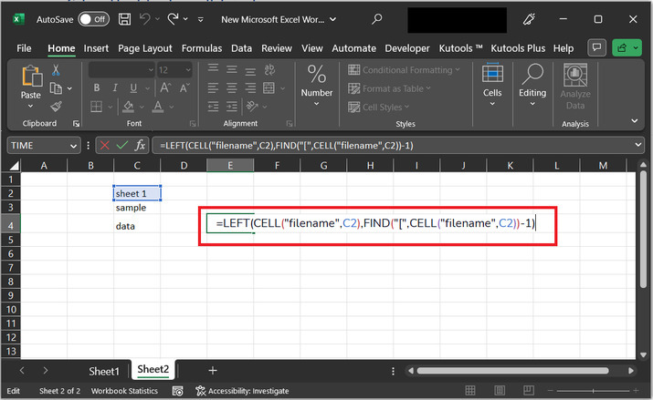 在此步驟中,使用者將能夠使用使用者定義的公式確定單元格的位置。鍵入以下給定的公式“=LEFT(CELL("filename",C2),FIND("[",CELL("filename",C2))-1)”。請參考程式碼截圖以瞭解資料處理過程。