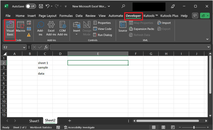 使用上面指定的相同 Excel 工作表。之後,點選“開發工具”選項卡,然後在“程式碼”部分下,點選“Visual Basic”選項。此步驟將允許使用者開啟 Visual Basic 編輯器。