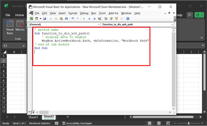 ' method name Sub function_to_dis_wrk_path() ' display data to msgbox MsgBox ActiveWorkbook.Path, vbInformation, "Workbook Path" ' end of sub module End Sub