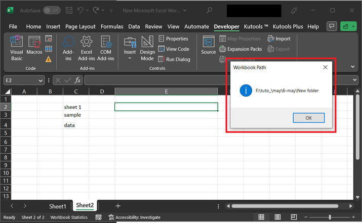上述步驟將顯示一個名為“工作簿路徑”的對話方塊。此對話方塊包含工作簿路徑。最後,點選“確定”按鈕。