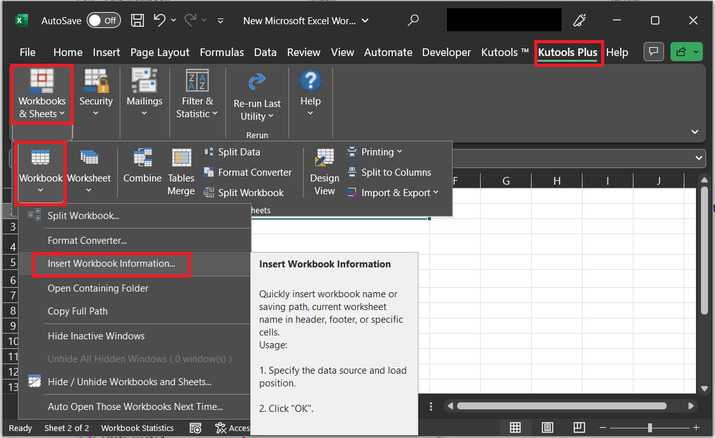 要將工作簿資訊插入 Excel 工作表。轉到“Kutools Plus”選項卡並選擇“工作簿和工作表”。之後,在“工作簿”選項下,選擇“插入工作簿資訊”選項。