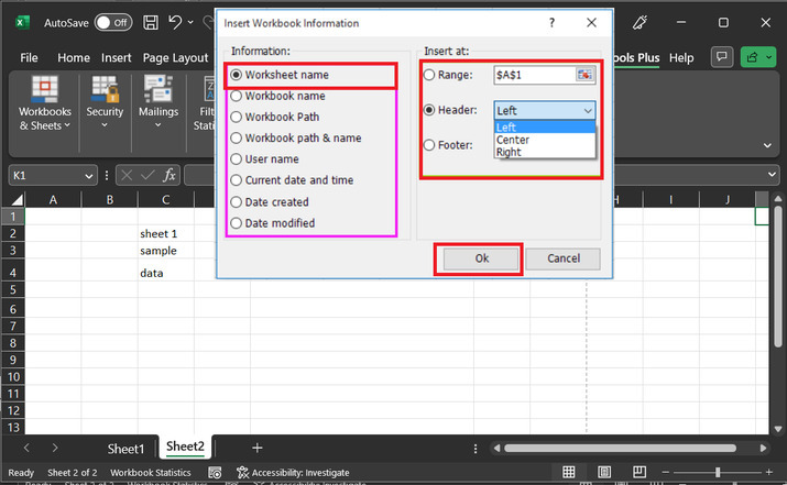 上述步驟將開啟一個“插入工作簿資訊”對話方塊。此選項包含“工作表名稱”標籤,並且在“插入位置”標籤中,在範圍選項中新增一個有效的範圍以顯示資料。對於此示例,在範圍標籤下,新增“A1”值。在標題部分,選擇“左對齊”選項。最後,點選“確定”按鈕。請參考以下給定的快照: