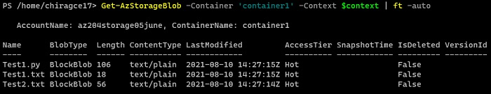 我們現在已經建立了 Azure 儲存上下文。要獲取特定容器中的 Azure 檔案(blob),我們將使用以下命令。