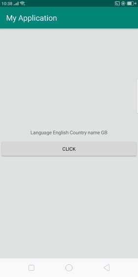 <?xml version="1.0" encoding="utf-8"?> <LinearLayout xmlns:android="http://schemas.android.com/apk/res/android" xmlns:tools="http://schemas.android.com/tools" android:layout_width="match_parent" android:layout_height="match_parent" tools:context=".MainActivity" android:background="#dde4dd" android:gravity="center" android:orientation="vertical"> <TextView android:id="@+id/language" android:layout_width="wrap_content" android:layout_height="wrap_content" /> <Button android:id="@+id/click" android:layout_marginTop="10dp" android:layout_width="match_parent" android:layout_height="wrap_content" android:text="click"/> </LinearLayout>