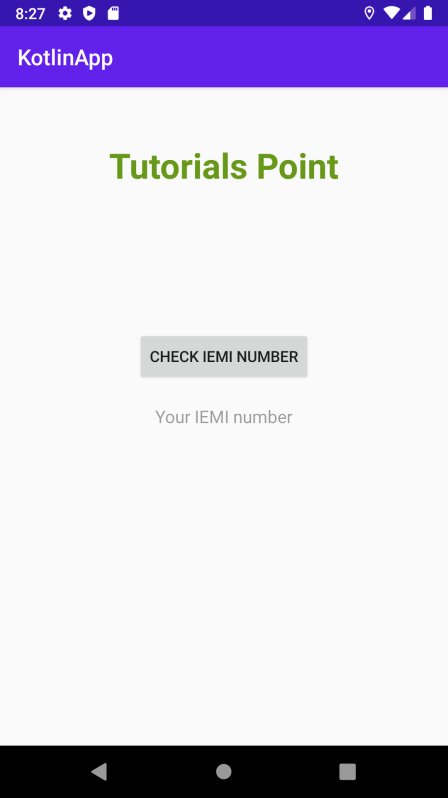 <?xml version="1.0" encoding="utf-8"?> <RelativeLayout xmlns:android="http://schemas.android.com/apk/res/android" xmlns:tools="http://schemas.android.com/tools" android:layout_width="match_parent" android:layout_height="match_parent" tools:context=".MainActivity"> <TextView android:layout_width="wrap_content" android:layout_height="wrap_content" android:layout_centerHorizontal="true" android:layout_marginTop="50dp" android:text="Tutorials Point" android:textAlignment="center" android:textColor="@android:color/holo_green_dark" android:textSize="32sp" android:textStyle="bold" /> <Button android:id="@+id/button" android:layout_width="wrap_content" android:layout_height="wrap_content" android:layout_above="@id/textView" android:layout_centerInParent="true" android:layout_marginBottom="20sp" android:text="Check IEMI number" /> <TextView android:id="@+id/textView" android:layout_width="wrap_content" android:layout_height="wrap_content" android:layout_centerInParent="true" android:hint="Your IEMI number" android:textColor="@android:color/background_dark" android:textSize="16sp" /> </RelativeLayout>