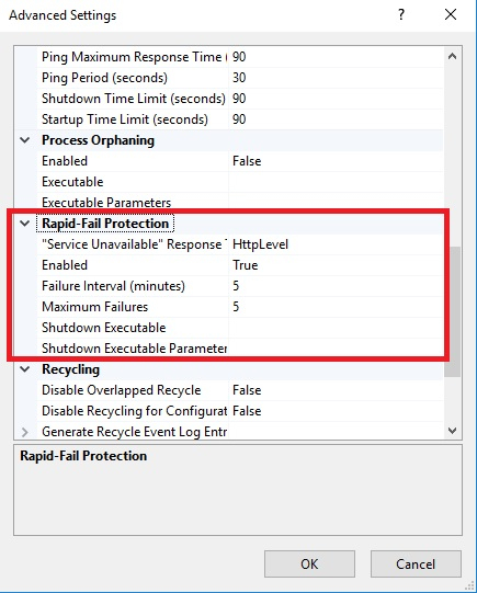 從 IIS 管理器的 GUI 中,你可以使用快速故障保護部分的應用程式池高階設定,獲得應用程式池故障設定,如下所示。