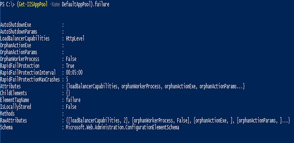 PS C:\> (Get-IISAppPool -Name DefaultAppPool).failure.rapidFailProtectionInterval Days : 0 Hours : 0 Minutes : 5 Seconds : 0 Milliseconds : 0 Ticks : 3000000000 TotalDays : 0.00347222222222222 TotalHours : 0.0833333333333333 TotalMinutes : 5 TotalSeconds : 300 TotalMilliseconds : 300000