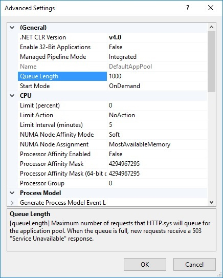 (Get-ItemProperty IIS:\AppPools\DefaultAppPool).queuelength