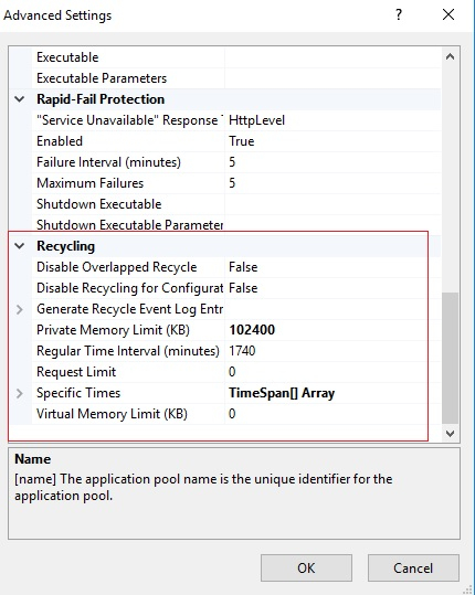 若要透過 GUI 獲取 IIS 應用程式池回收設定,您需要檢查應用程式池高階設定。