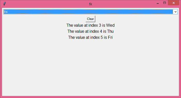 # Import the required libraries from tkinter import * from tkinter import ttk # Create an instance of tkinter frame or window win = Tk() # Set the size of the window win.geometry("700x350") # Create a function to clear the combobox def clear_cb(): cb.set('') # Define Days Tuple days= ('Sun','Mon','Tue','Wed','Thu','Fri','Sat') # Function to print the index of selected option in Combobox def callback(*arg): Label(win, text= "The value at index " + str(cb.current()) + " is" + " "+ str(var.get()), font= ('Helvetica 12')).pack() # Create a combobox widget var= StringVar() cb= ttk.Combobox(win, textvariable= var) cb['values']= days cb['state']= 'readonly' cb.pack(fill='x',padx= 5, pady=5) # Set the tracing for the given variable var.trace('w', callback) # Create a button to clear the selected combobox text value button= Button(win, text= "Clear", command= clear_cb) button.pack() win.mainloop()