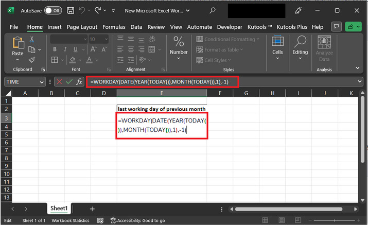 WORKDAY()方法將計算上述步驟獲得的日期之前的最後一個工作日。WORKDAY函式考慮任何節假日或週末,這些由可選引數指定。