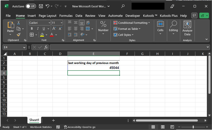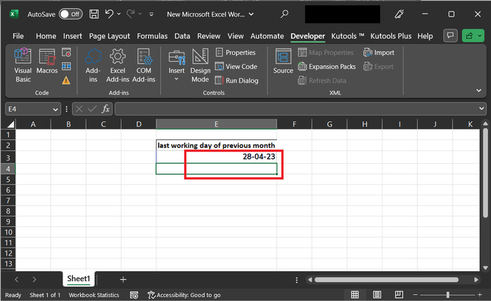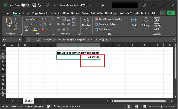 本文將介紹如何在Excel中生成上個月最後一個工作日的概念。第一個示例將指導使用者使用公式的過程,第二個示例將使用VBA程式碼執行相同的任務。例如,如果今天是2023年5月6日,那麼假設週末和節假日不是工作日,則前一個月(4月)的最後一個工作日為2023年4月29日。