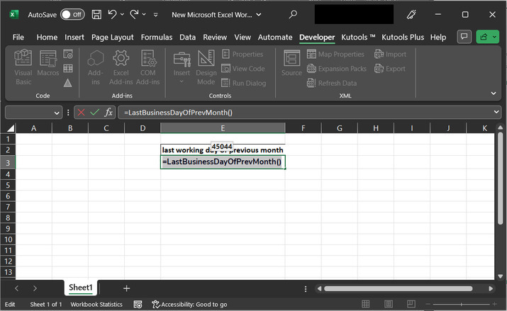 之後,使用鍵盤組合鍵“Alt + Q”退出工作表,並呼叫方法“=LastBusinessDayOfPrevMonth()”,如下所示: