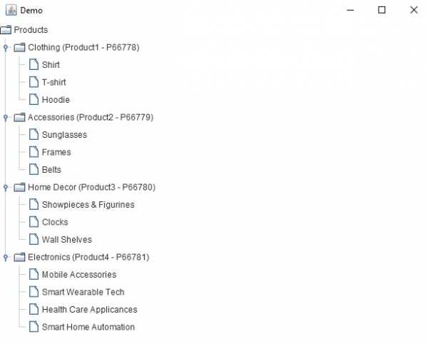 DefaultMutableTreeNode node4 = new DefaultMutableTreeNode("Electronics (Product4 - P66781)");