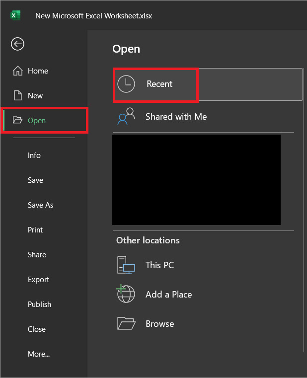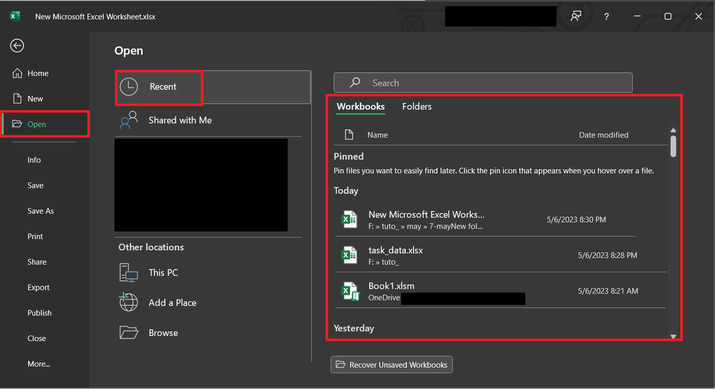 這將開啟以下對話方塊。在開啟的螢幕中,單擊“開啟”,然後選擇“最近”選項。