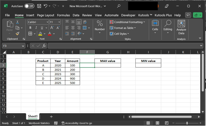 開啟工作表,建立如下所示的相同資料。此表包含三列:第一列包含產品名稱,第二列包含年份,第三列顯示資料量。使用者需要根據提供的表計算最大值和最小值。