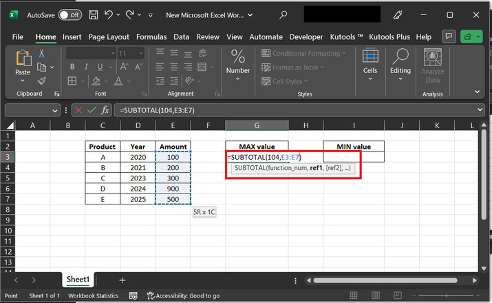 最大值指最高資料值,最小資料值包含最小的可用資料值。本文將介紹兩種方法:使用 SUBTOTAL 函式計算最大值和最小值,以及使用 Kutools 外掛執行相同任務的方法。需要注意的是,Excel 軟體本身已提供這兩種功能,使用者只需使用現有選項即可獲得結果。