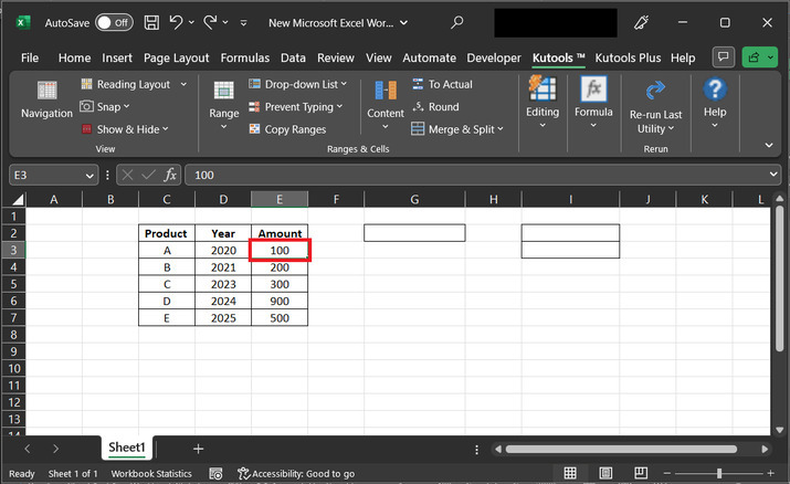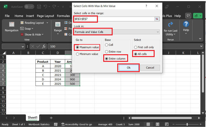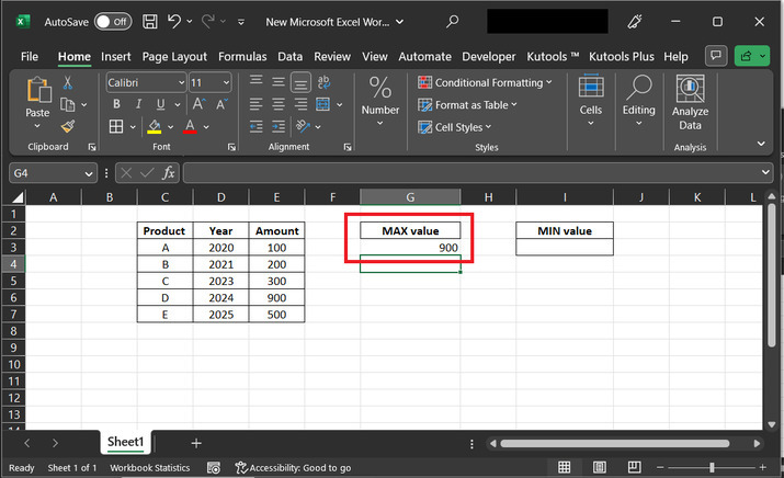 示例 2:使用 Kutools 擴充套件獲取 Excel 中可見單元格的最大值和最小值